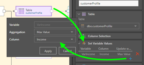 Expand the Set Variable Values window to pass a variable to the node. To do this, click the plus sign and then select the relevant variable, the aggregation type, and the relevant column.