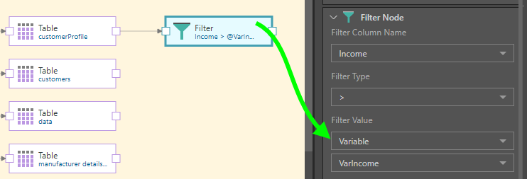 Finally, the Filter node is connected and used to filter the table by the Income column, using the variable: