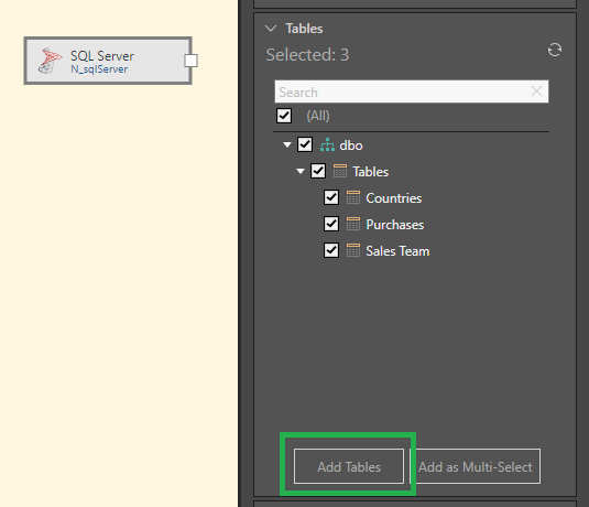 The first method is to select all the required tables from the Properties panel of the data source node, and then click Add Tables (green highlight below):