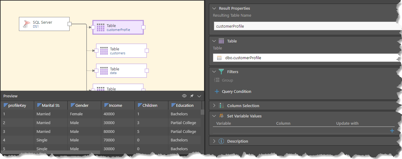 The table node is used to connect a single table to a data source node. Unlike the Tables node, many nodes can be connected to a single data source, with each node representing a different table. A range of operations and functions can then be connected to any given table node in order to perform any required data cleansing or manipulation on the data set before loading it into a target.