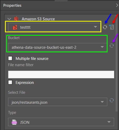 With the node selected, go to the Properties panel. Select the Amazon S3 source from the drop-down list (orange highlight below). The list exposes the Amazon S3 sources that have been configured in Pyramid by an Admin. If the required Amazon S3 source doesn't appear, try refreshing the list (blue arrow). Admin users can configure additional Amazon S3 sources here by clicking the Add Server button (red arrow).