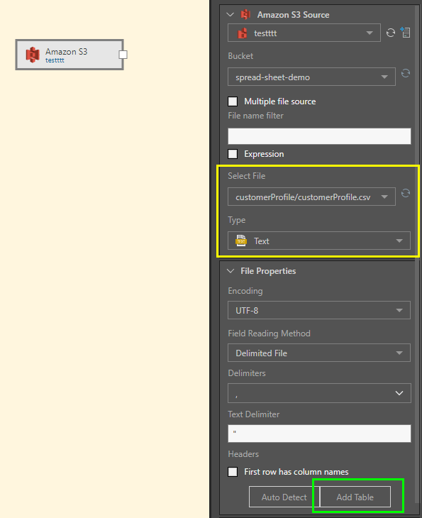In this example. a CSV file is copied from the data source; the file type is set to Text (yellow highlight below). The table is added by clicking 'Add Table' from the File Properties window (green highlight):