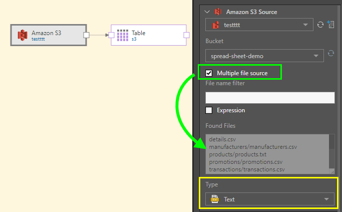 In this example, multiple .csv and. txt files are selected from the given bucket by enabling 'Multiple file source' (green highlight below). The text type is set to Text (yellow highlight), and the table added to the data flow. All the files in the selected bucket are combined into a single table: