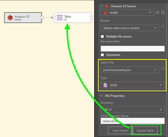 In this example. a JSON file is copied from the data source, and the file type is set to JSON (yellow highlight below). The table is added by clicking 'Add Table' (or 'Update Table') from the File Properties window (green highlight):