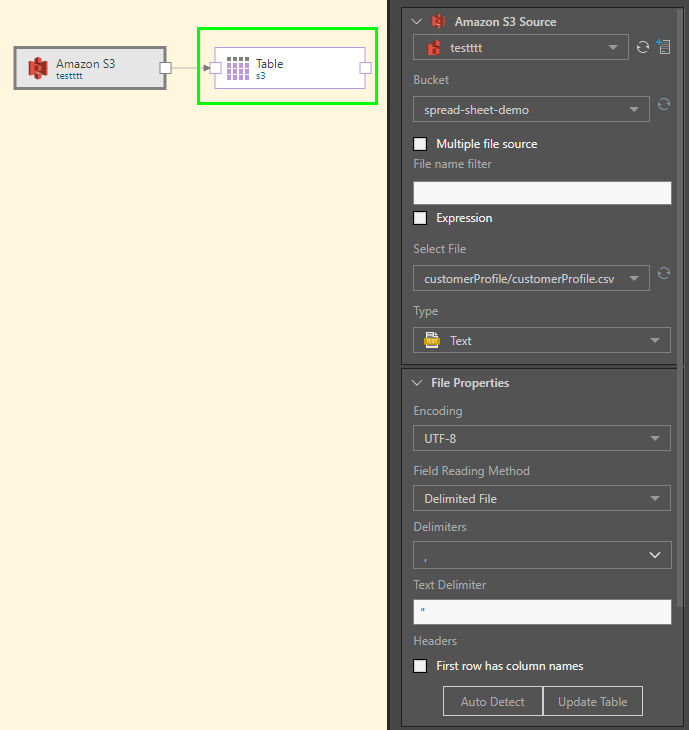 The given file is converted into a table; if multiple files are selected from the Amazon S3 source, each file will be combined into a single table.