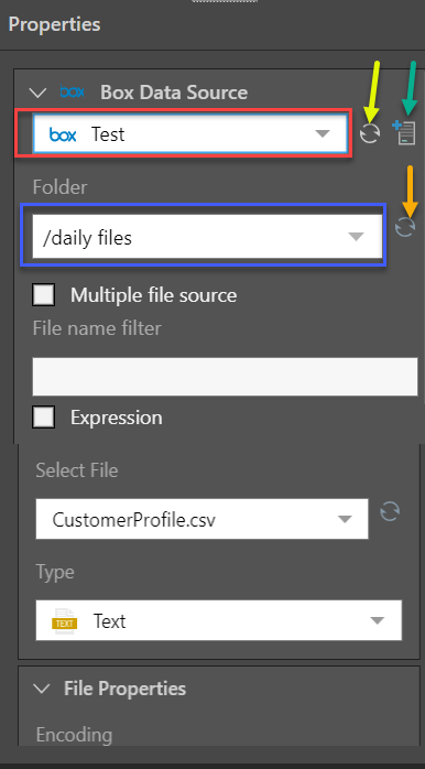 Connect to a Box datasource by adding the Box node to the data flow. With the node selected, go to the Properties panel. Select the Box storage source from the drop-down list (red box below). The list exposes the Box sources that have been configured in Pyramid by an Admin. If the required Box source doesn't appear in the list, try refreshing the list (yellow arrow). Admin users can configure additional servers here by clicking the Add Server button (green arrow).