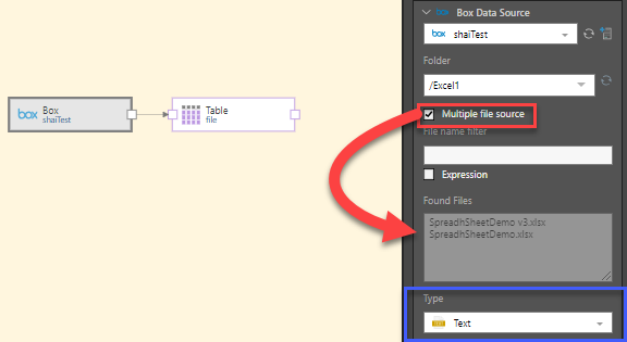 In this example, an Excel file is copied from the datasource and the file type is set to Text (red box below). The table is then added by clicking 'Add Table' from the File Properties window (blue box):