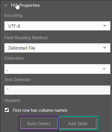 Next, you'll need to set the file properties according to the given file and file type. This can be done manually, or by using the Auto Detect function (purple highlight below).