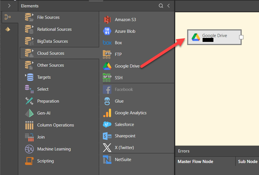 Note: If the Google Drive node is grayed out in the Cloud Sources menu, it is because your administrator needs to create Google Drive as a data source before you can use it as a node in your data flow. For details, see Google Security Setup.