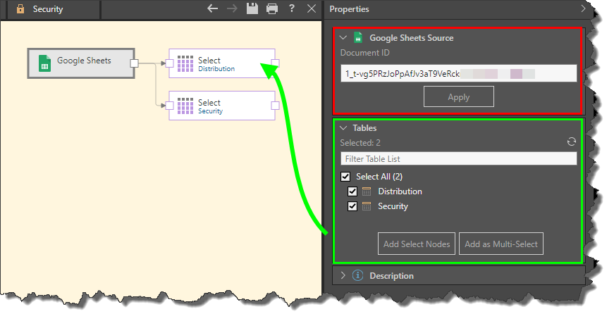 To connect to a Google Sheet, add the Google Sheets node to the data flow and then enter the relevant ID or URL in the Document ID field of the Properties panel (red highlight below).
