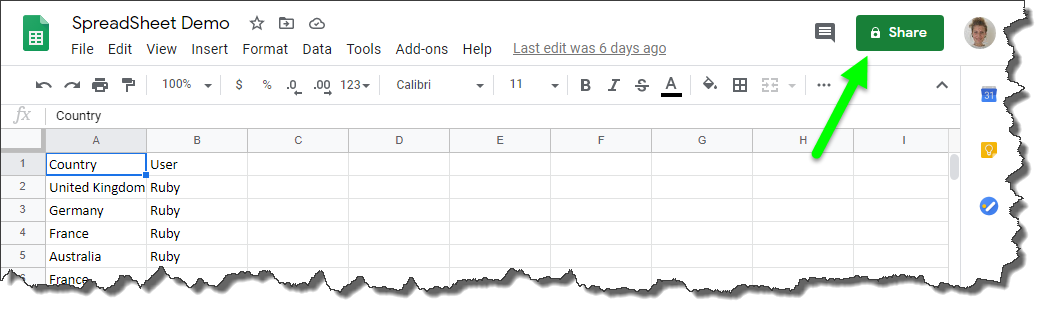 To ensure that Pyramid can connect to it, go the Google Sheet and click the green 'Share' button: