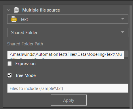The Multi Files source node is used to upload or connect to multiple files of the same type. The Multi File source node supports Text, JSON, XML, and Excel files, and supports both local file upload and pointer to a shared folder on a network drive.