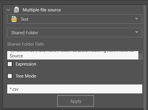 In this example, the Mutli File source node was used to connect to multiple CSV files in a shared folder: