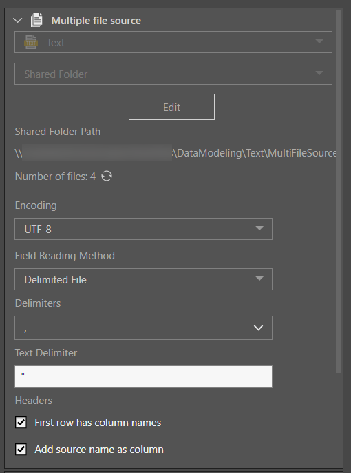 After the folder path is provided, the files must be configured. As Pyramid is connecting to Text files, the encoding and reading method must be supplied, as well as the value delimiter and text delimiter. Next, the first row in the files was specified as column names, and the source name column added:
