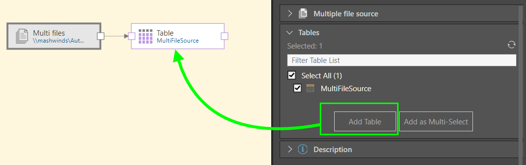 Finally, the table is connected to the data flow using the Add Table function from the Tables window: