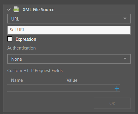 To connect to an XML file via its URL, paste the URL in the Set URL field. Enable 'Expression' to provide the URL in the context a dynamic PQL expression, created in the PQL Editor.