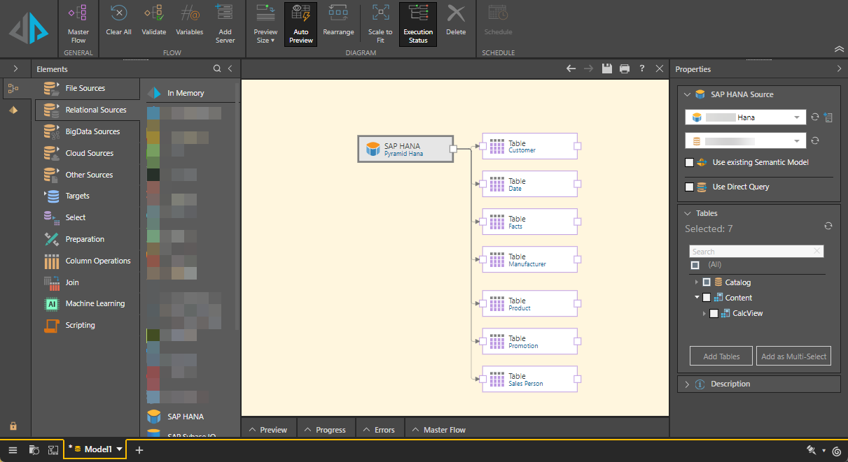 Once SAP HANA has been configured as a data source in the Admin Console, it can be used to build data preparation flows in Model.