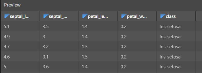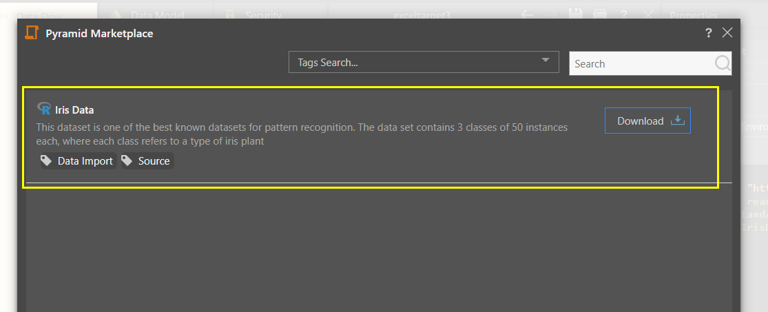 In this example, the Iris Data script is downloaded from the Pyramid Marketplace to import the data set and convert it to a table.