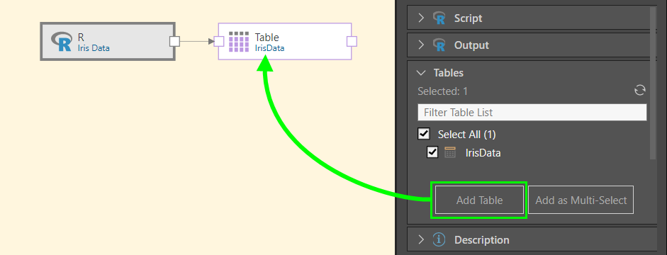 Next, the new table was connected to the source node by clicking the Add Table button: