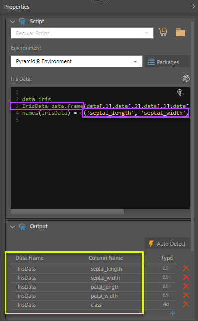 Click 'Auto Detect' from the Output window to open the 'Auto-detect output columns' dialog, where you can enter the data frame. Pyramid will then detect the given data frame and its columns in the script, and add them to the output list.