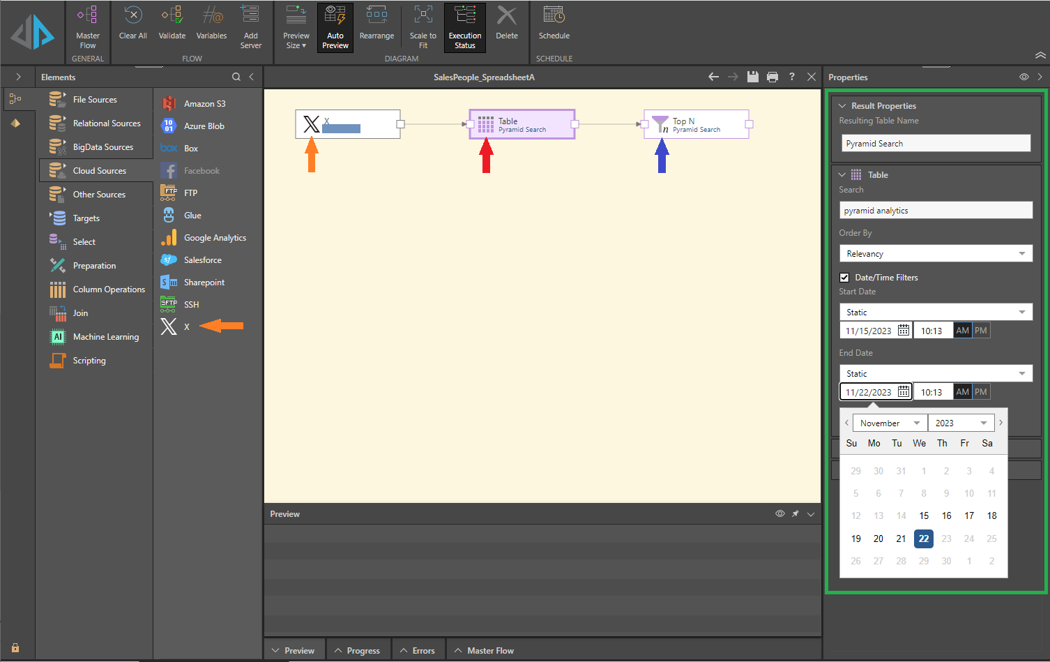 1. Click Cloud Sources and drag-and-drop X onto the canvas (orange arrows), and, from the Properties panel, set: