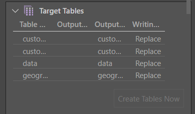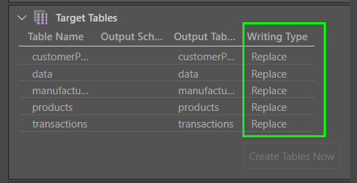 From the Target Tables window, you can rename the table outputs and change the writing type.