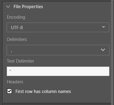 - Headers: if the file's first row is made up of column names, enable 'First row has column names'.
