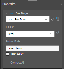 From its Properties panel, select the required Box target from the server list drop-down, then choose the required folder and provide the path to the folder. The path can be a static value pasted in the Path field, or you can create a dynamic PQL expression in the PQL editor.