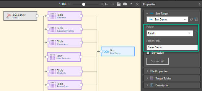 In this example, the user connected the data flow to a Box target; the server, folder, and path were provided in the Target properties (green box below).