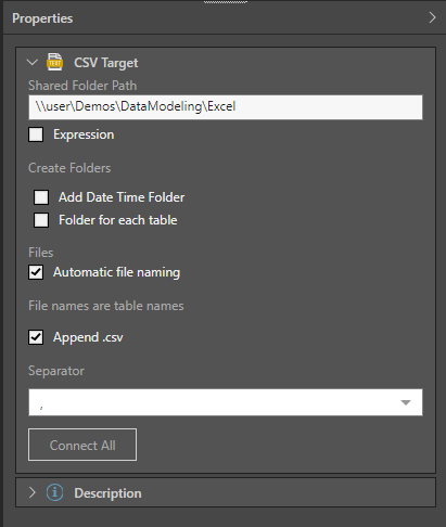 Finally, click 'Connect All' to connect the target node to the data flow. As usual, you can add a description to the node's Properties panel.