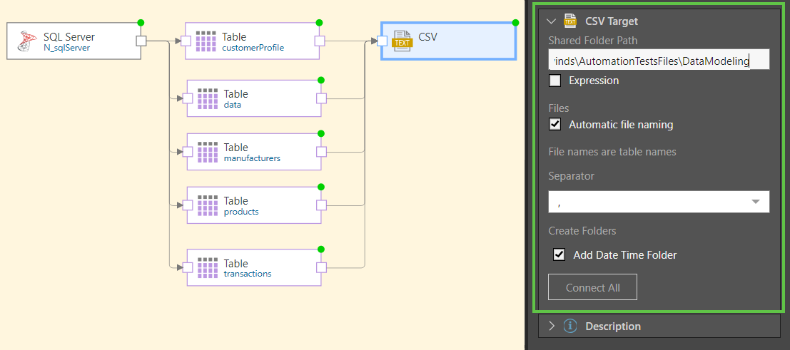 In this example, the ETL was loaded from an SQL server into an CSV database. As seen in the Target properties (green highlight below) the CSV target database was saved to a shared folder called DataModeling. Both Database Name and Date Time folders were enabled before connecting the tables to the target. The next step is to process the ETL.