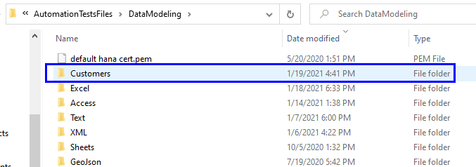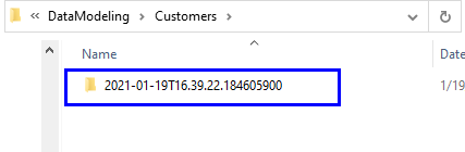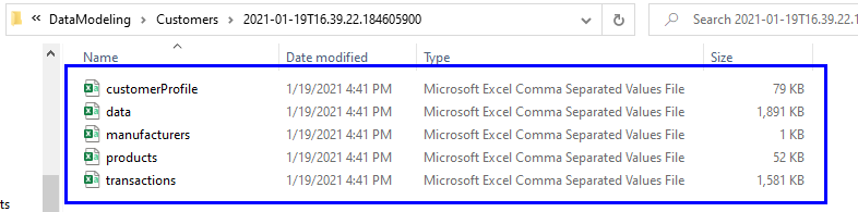 Once the ETL is executed, the CSV files are saved to the given folder location, inside the Database Name folder and Date Time subfolder. Here we see the database folder 'Customers':