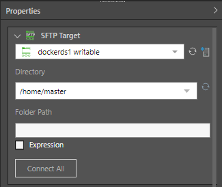 From its Properties panel, select the required target from the server list drop-down, then choose the required Directory and provide the folder path. The path can be a static value pasted in the Folder Path field, or you can create a dynamic PQL expression in the PQL editor.