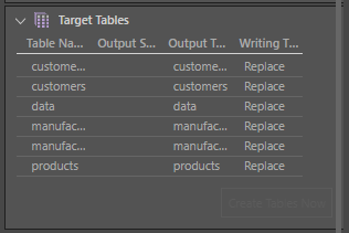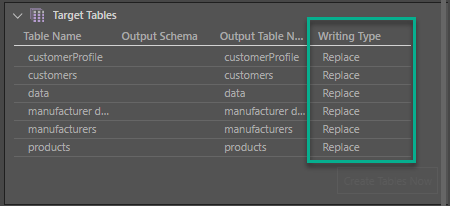 From the Target Tables window, you can rename the table outputs and change the writing type.