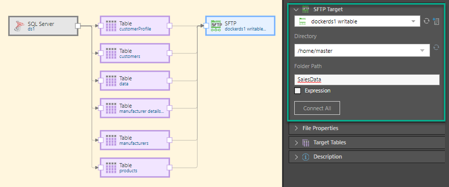 In this example, the user connected the data flow to an SFPT target; the server, directory, and folder path were provided in the Target properties (green highlight below).