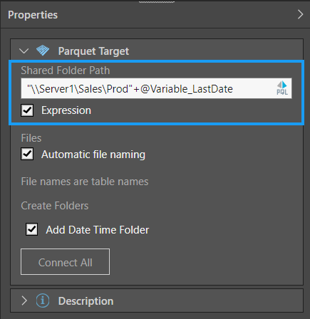 In this example, a dynamic PQL expression is provided to point to a shared Parquet folder path to append the value of the given variable to the file path.