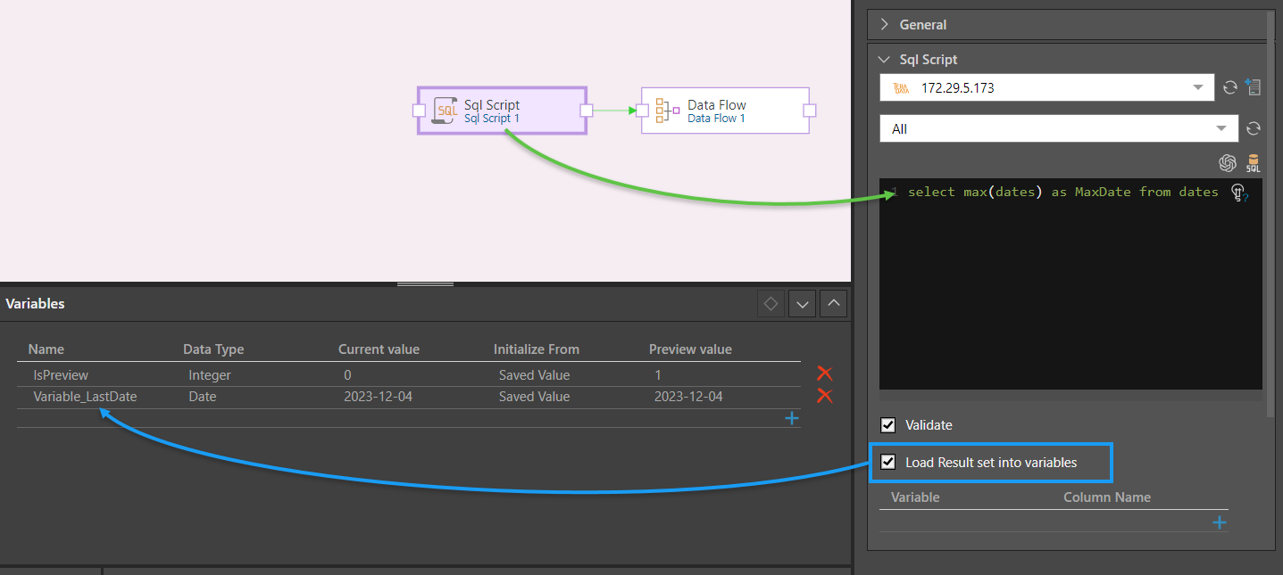 When the Master Flow runs, the SQL script will return the last date, which will be injected into the variable.