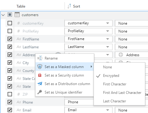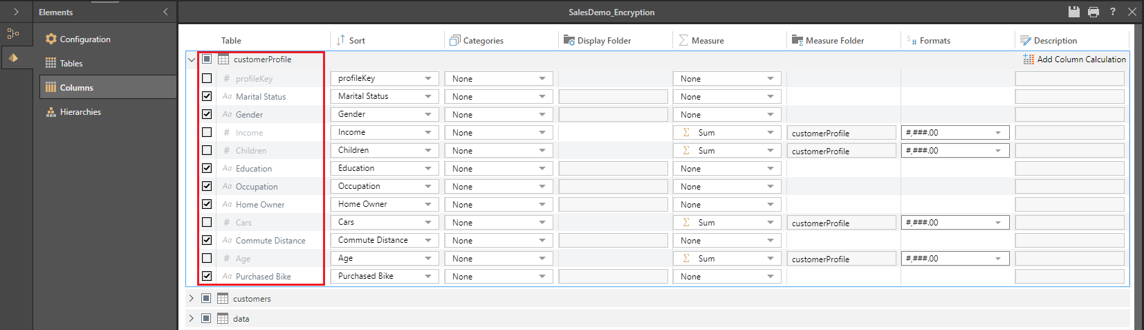 Check a column to keep it in the data model, or hide a column by unchecking it. Hidden columns are not shown as attributes in the final model, but that can be used to configure calculated columns, measures, and user hierarchies.