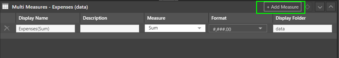 The Multi Measures panel will open, exposing any existing measure that's been assigned to the column. If no measure was assigned, a new will be assigned automatically. Add more measures to the column by clicking the 'Add Measure' button (green highlight below):