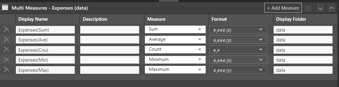For each measure added, add a display name, description (optional), measure type, format, and measure display folder.