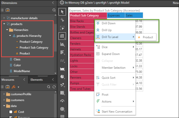 Hierarchies are constructed from the Hierarchy panel, by adding the required columns from a table. The panel displays visible table in the model; each table can be expanded to view its columns.