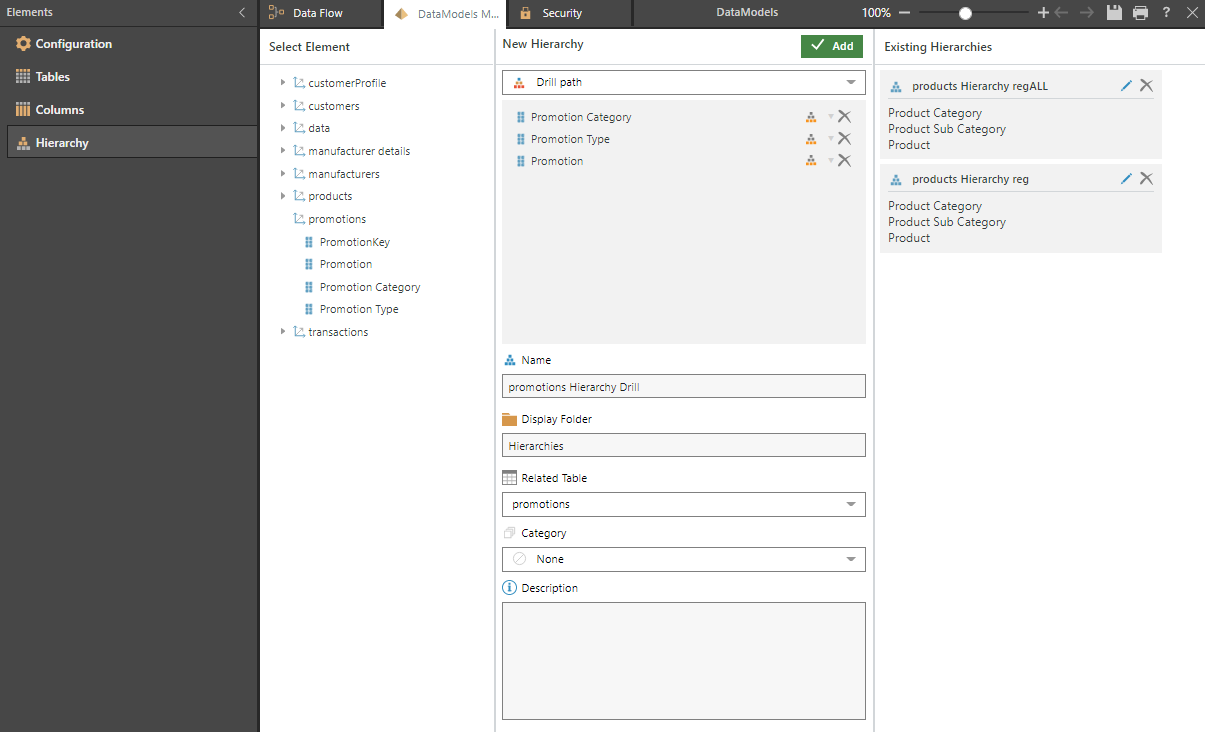 Hierarchies are constructed from the Hierarchy panel, by adding the required columns from a table. The panel displays visible table in the model; each table can be expanded to view its columns.
