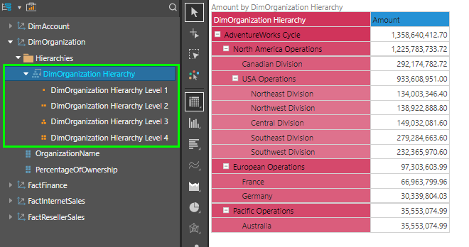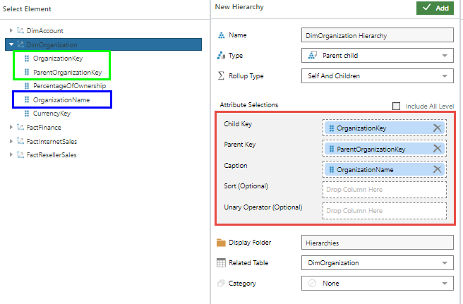 The OrganizationKey and ParentOrganizationKey columns (green highlight below) were added as child key and parent key in the Attribute selections (red highlight). The OrganizationName column (blue highlight) was added as the caption column.