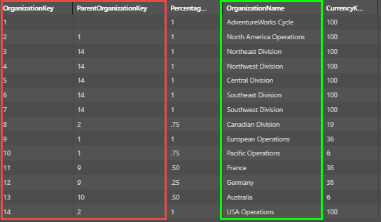 In this example, an organizational parent child hierarchy was built. In the table, we have the OrganizationName column (green highlight below) and the OrganizationKey and ParentOrganizationKey columns (red highlight).