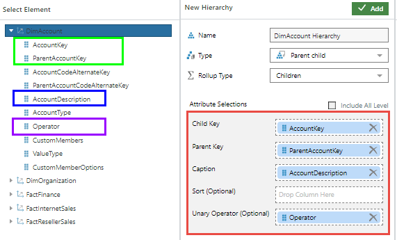The AccountKey and ParentAccountKey columns (green highlight below) were added to Child Key and Parent Key in Attribute Selections (red highlight). AccountDescription (blue highlight) was added to Caption, and the Operator column (purple highlight) was added as the Unary Operator.