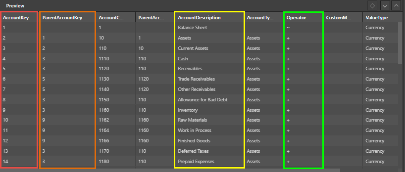 In this example, an accounting parent child hierarchy was built. The table contains the AccountDescription column (yellow highlight below), the AccountKey (red highlight), the parent key (orange highlight), and the operator column (green highlight).