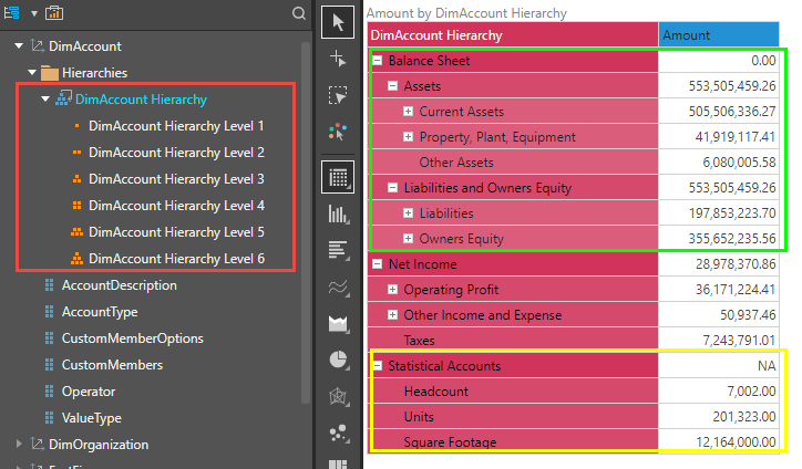 We also see how the unary operator defined the way that values were calculated. For instance, under Balance Sheet (green highlight below), Liabilities and Owners Equity was subtracted from Assets. While under Statistical Accounts (yellow highlight) the child values were not aggregated or subtracted, because they represent distinct attributes that cannot logically be rolled up to calculate a single value.