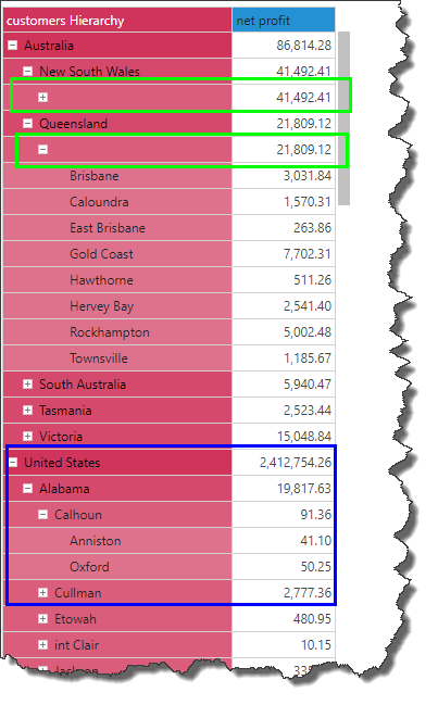 So as we see, when Australian states are expanded a blank row header is exposed, and the corresponding data cells show data at the State level (green highlights below). Meanwhile, when US states are expanded we see the County level (blue highlight).