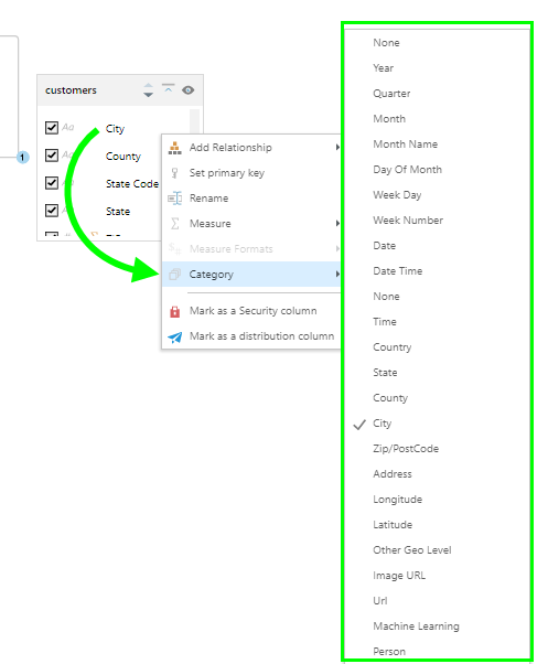 For instance, assigning the Country column to the Country category allows users to create map visuals with the Country column in Discover.