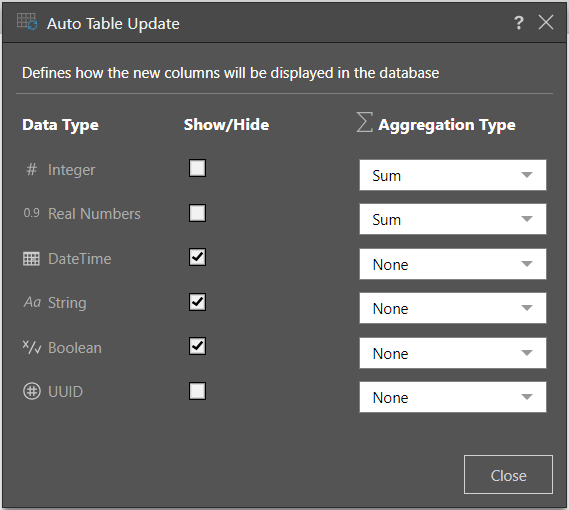 For each Data Type in the model, determine whether to show or hide it. Then select the Aggregation Type that will be used when the data is displayed. For example: Sales information is usually displayed as a Real Number and Sum, Number of Sales would be displayed as an Integer and a Count.